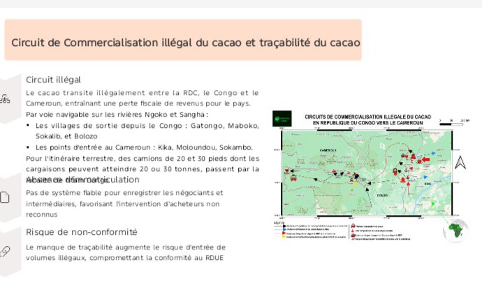 « Près de la moitié du cacao congolais traverse illégalement la frontière pour être recyclé au niveau du Cameroun. C’est donc un flux illicite du cacao congolais vers le Cameroun, ce qui est contraire au Règlement européen sur les produits issus de la déforestation ; qui exige que le cacao de chaque pays qui exporte vers l’Union Européenne soit bien tracé et respectent toutes les lois du pays », révèle Maixent Fortunin Agnimbat Emeka, expert au FGDH.