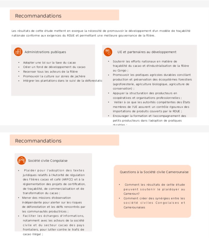 Selon le FGDH, le commerce illégal du cacao dépasse les frontières nationales, rendant toute réponse strictement nationale insuffisante. Les flux transfrontaliers non contrôlés entre la République populaire du Congo et le Cameroun par exemple constituent un défi majeur, nécessitant une approche concertée des acteurs de la société civile des deux pays.
