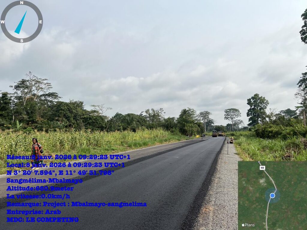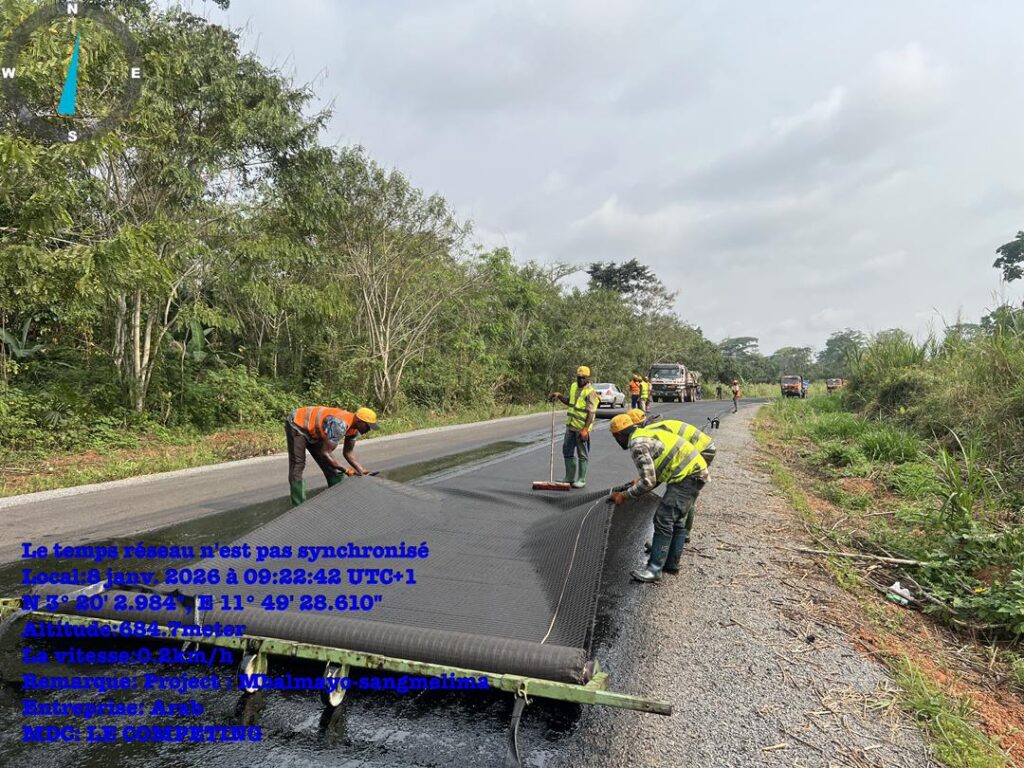 La pose des géogrilles, destinés à renforcer la structure de la chaussée, à améliorer la portance du sol support et à accroître la durabilité de la route avant la mise en œuvre de la couche de roulement, progresse de manière significative sur le lot N°2 (PK 39+500 à Nkolaya III et le PK 82+000 à Nkout II) du projet de réhabilitation de la route Mbalmayo–Sangmélima